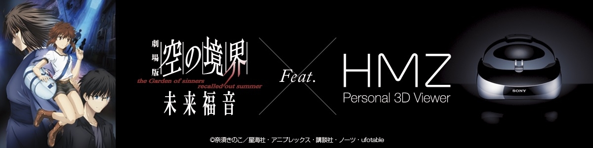 2014年2月5日 12:00ソニーマーケティング株式会社(本社:東京都港区、代表取締役:河野 弘)は、株式会社アニプレックス(本社:東京都千代田区、代表取締役:夏目 公一朗)の劇場アニメーション作品『劇場版「空の境界」未来福音』を、ソニー株式会社のヘッドマウントディスプレイ“Personal 3D Viewer”(以下、ヘッドマウントディスプレイ)『HMZ-T3W』『HMZ-T3』を使ってより深く堪能する、没入体感キャンペーンを実施いたします。