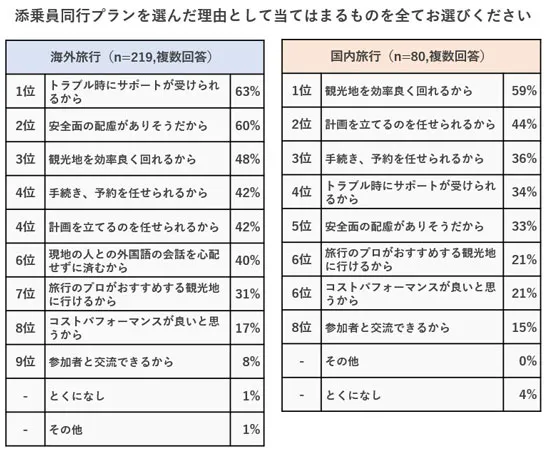 海外旅行では、選んだ理由として「トラブル時にサポートが受けられるから」(63%)と答えた人が最も多くなる結果に。また「安全面の配慮がありそうだから」(60%)との回答も同じくらい多く、添乗員同行のプランに安心・安全な旅を求めている人が多いことがわかります。