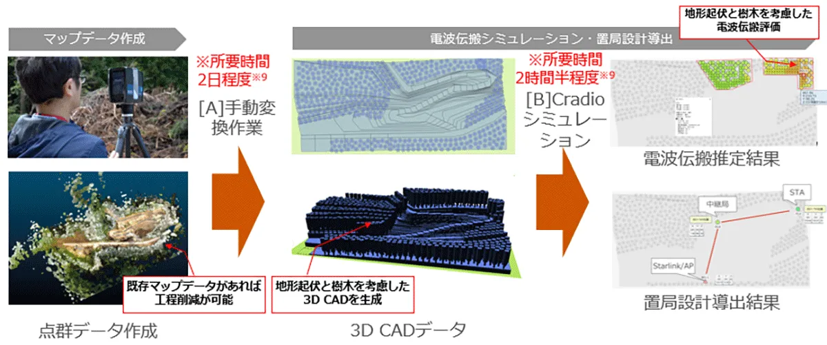 ※9:Cradio(R)を用いた作業所要時間について、2日や2時間半という時間は本実証の実績値(例)であり、案件の規模などでより時間がかかる場合があります。