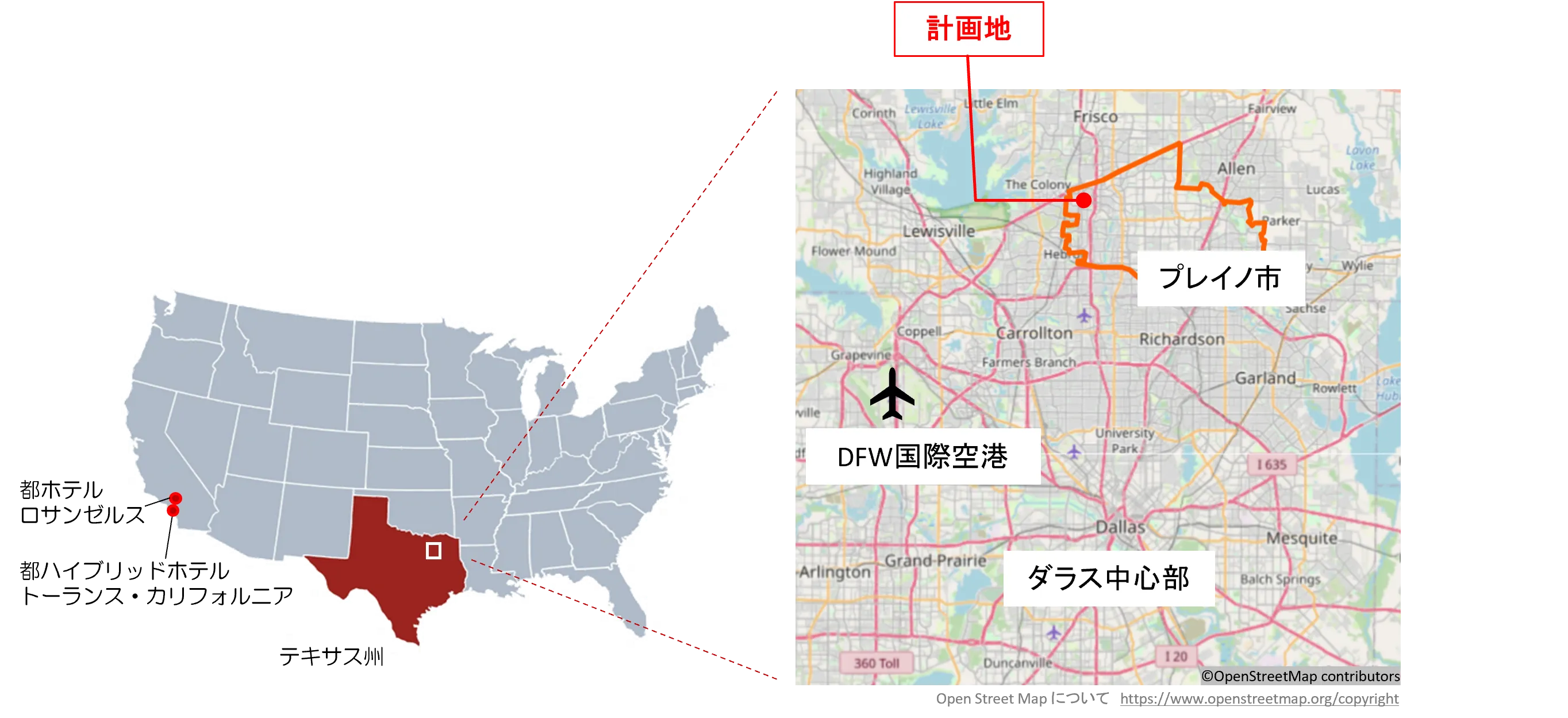 テキサス州プレイノ市は、米国内でも有数の主要都市であるダラス市を中心とするダラス・フォートワース複合都市圏に位置し、日系を含めた有力企業の本社や研究開発センターなどが集まる人口約30万人の都市です。このようなエリアの特性を踏まえ、新ホテルについては、良質な宿泊施設、本格的な日本食レストラン、中規模宴会場を備えるとともに、ハード、ソフトなどあらゆる面で日本文化をアピールすることで、日系ホテルならではの特徴を活かした競争力の高いホテルとする計画です。
