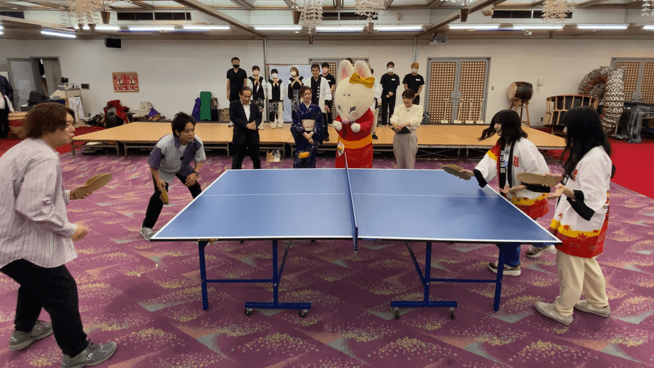 ラケットをスリッパに持ち替えて、旅館自慢のご当地グルメをかけて真剣勝負!