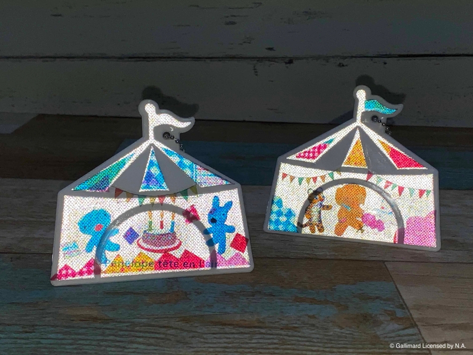 ↑ペネロペデザインのシールで作るリフレクターキーホルダー。車のライトなど光が当たるとピカッと反射します。フラッシュを光らせて撮影しても右の写真のように「ペネロペ」たちが楽し気に浮かび上がります。