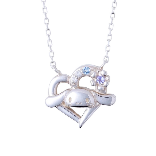 オープンハートモチーフからお顔を出すシナモロールがかわいいシルバーネックレス。
