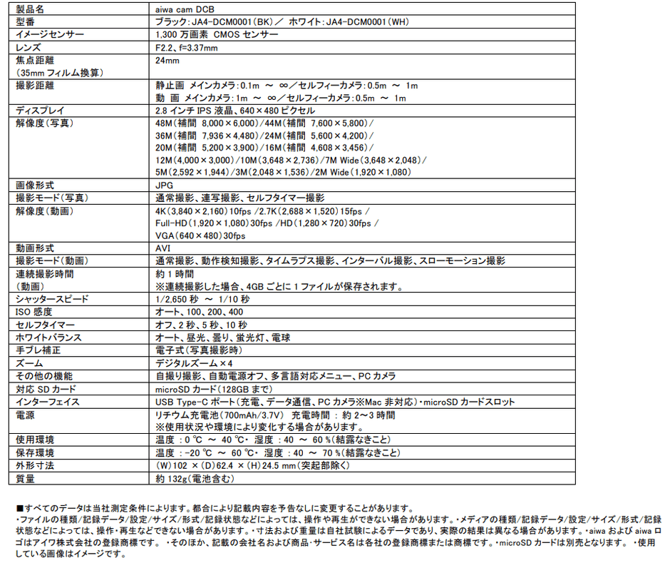 【aiwa cam DCB 主な仕様】