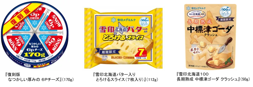雪印メグミルク株式会社(本社:東京都新宿区、代表取締役社長:佐藤雅俊)は、『復刻版 なつかしい厚みの 6Pチーズ』(170g)、『雪印北海道バター入りとろけるスライス(7枚入り)』(112g)および『雪印北海道100 長期熟成 中標津ゴーダ クラッシュ』(50g)を期間限定発売いたします。期間は2025年3月1日(土)から2025年8月31日(日)までを予定しています。