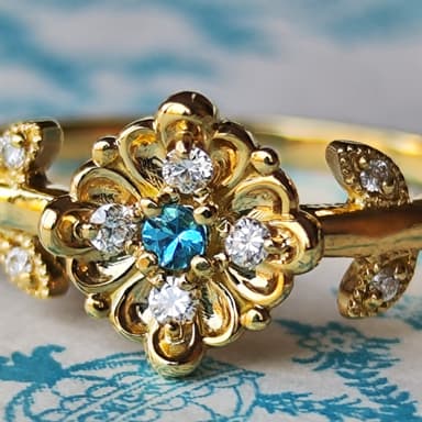 中央にはパライバトルマリンを配置し、花びらの内側にはダイヤモンドをセット。ぷっくりとした可憐な花を表現し、アームには葉っぱのモチーフを施して、横から眺めても美しいデザインに仕上げています。
