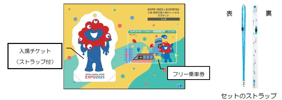 オリジナルデザインの近鉄電車フリー乗車券と大阪・関西万博入場チケット(ストラップ付き)がセットになっています。