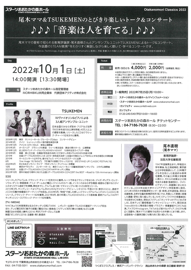 尾木ママの愛称で知られる教育評論家・尾木直樹さんとアンサンブルユニットTSUKEMENによるトーク&コンサート。今話題のSTEAM教育*をやさしく解説しながら楽しく聴いて・学べるコンサートです。