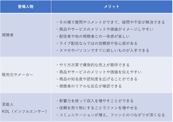 ライブコマースに登場する人たちには、それぞれに大きなメリットがあります。
