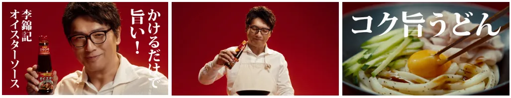 「かけるだけで旨い!李錦記オイスターソース」と、「革新派」役の高橋さんが登場。濃厚な牡蠣のコクをダイレクトに味わえるレシピ「コク旨うどん」を提案します。こちらに語りかける高橋さんの、優しい表情に注目です。