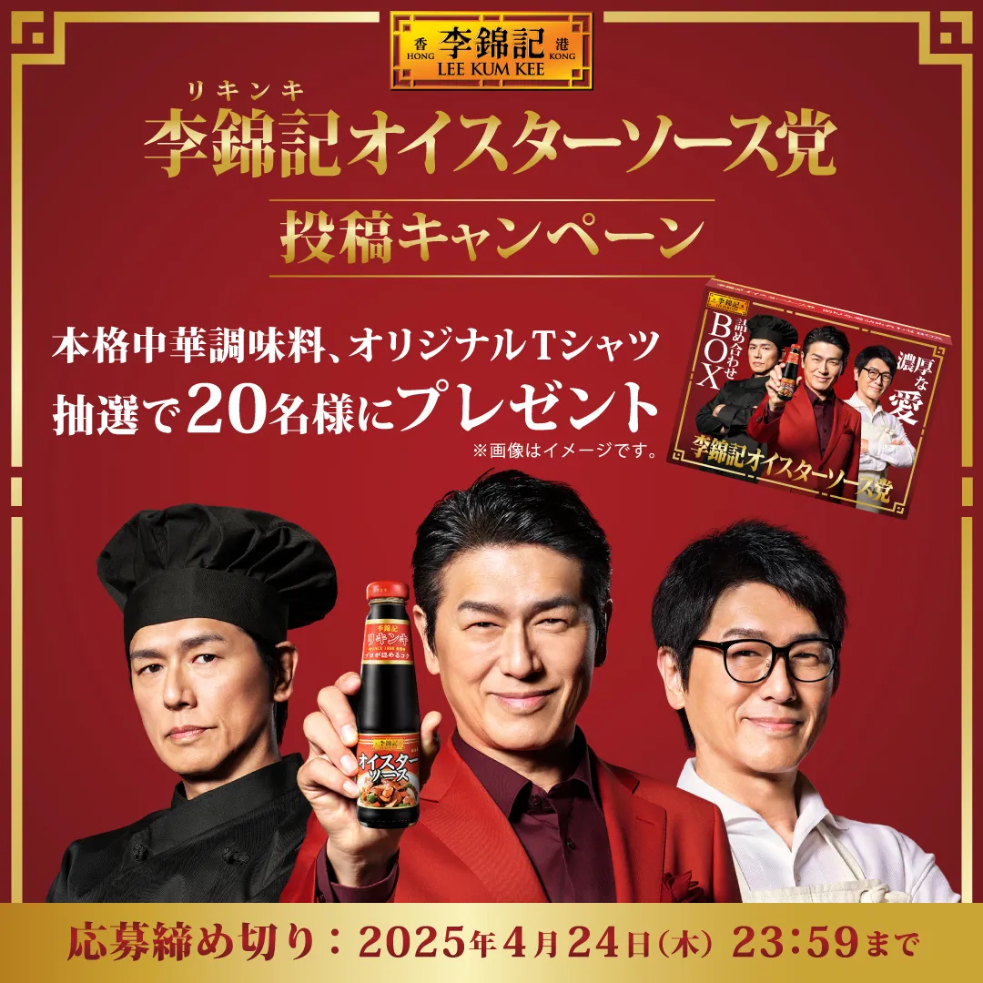 ・賞品:プロ御用達 本格中華調味料ギフトセット(李錦記オイスターソース255g、パンダブランドオイスターソース スパウトパウチ*3/3発売予定、豆板醤・甜面醤・豆鼓醤(3種ともチューブ) 、海鮮XO醤、李錦記オイスターソース党オリジナルTシャツ)