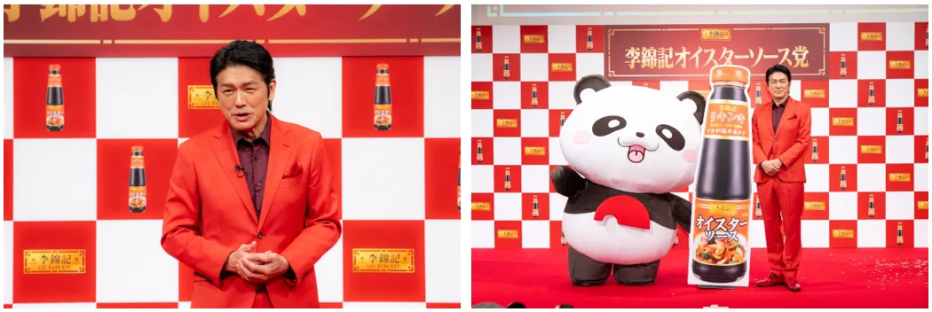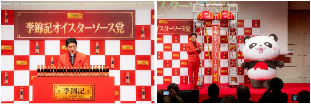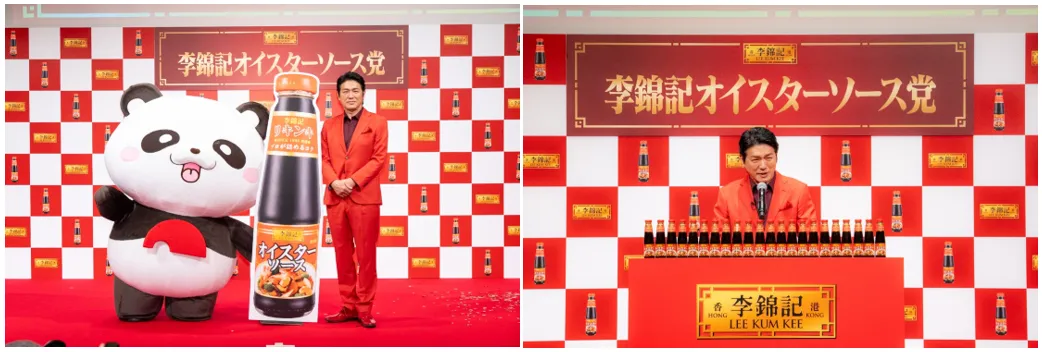 そして、新CMをお披露目したのち、今回李錦記オイスターソース党の党首に就任した高橋克典さんが、CMと同じ真っ赤なスーツ姿で登場。早速、党首として「この度、李錦記オイスターソース党党首に就任しました、高橋克典です。まず一つ、オイスターソースの開祖として、伝統も革新も切り拓きます。二つ、秘伝の製法で、本物のコクと旨みにこだわりつづけます。三つ、李錦記オイスターソースの濃厚な愛を伝え、同志を増やします!」という3つの約束を掲げました。李錦記公式キャラクターのパンダくんもお祝いに駆けつけ、党結成と、李錦記オイスターソースのますますの隆盛を祈願して、くす玉割りを行いました。