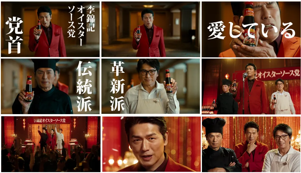 高橋克典さんが出演する新CM計3本を、2月26日(水)よりウェブ上で公開します。高橋さんが、真っ赤なスーツを着た「党首」、威厳ある黒色のコック服姿の「伝統派」、優しくカジュアルな印象の「革新派」の、1人3役を演じています。60秒版のCMでは3人が颯爽と歩きながら登場。李錦記オイスターソースの、秘伝の製法で世界100以上の国で愛される「伝統派」な側面と、加熱せずとも幅広い料理に活用できるなどの「革新派」な側面、2つの魅力を語ります。高橋さんのオイスターソース愛が炸裂する「愛している!」のセリフにも注目です。