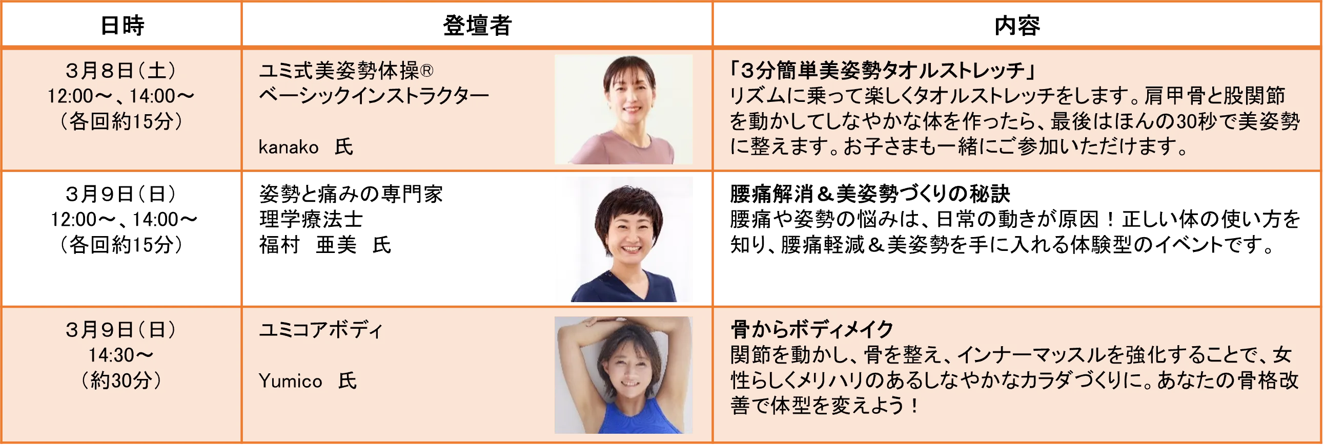 その場で実践して美しいカラダへ!体験会スケジュール(場所はいずれも2階ウエルカムガレリア。参加費無料、事前予約不要)