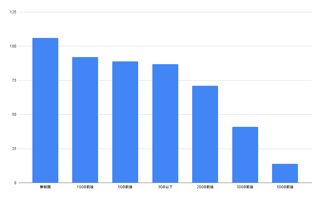 理想のデータ容量として「無制限」と「10GB前後」が上位を占め、多くのユーザーが10GB以上を求めています。