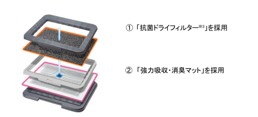 2:「強力吸収・消臭マット」採用で消臭効果が長時間持続します。