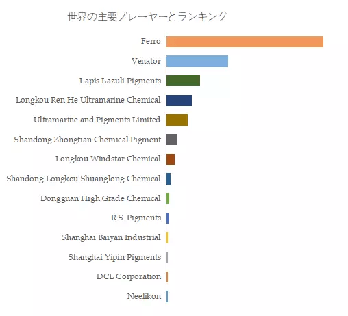 本レポートでは、Ferro、Venator、Lapis Lazuli Pigments、Longkou Ren He Ultramarine Chemical、Ultramarine and Pigments Limitedなど、ウルトラマリンブルーの主要プレーヤーを紹介しています。