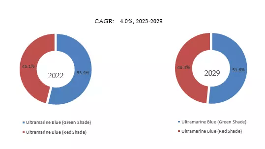 製品タイプ別では、ウルトラマリンブルー(グリーンシェード)が最大のセグメントで、2022年には売上高ベースで53.9%、販売数量ベースで46.3%のシェアを占める。