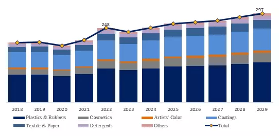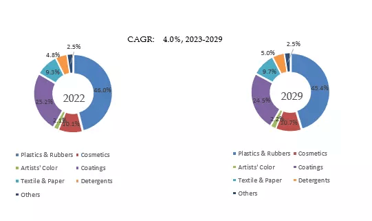 製品の用途別では、プラスチックとゴムが最大の用途で、2022年には46%のシェアを占める。