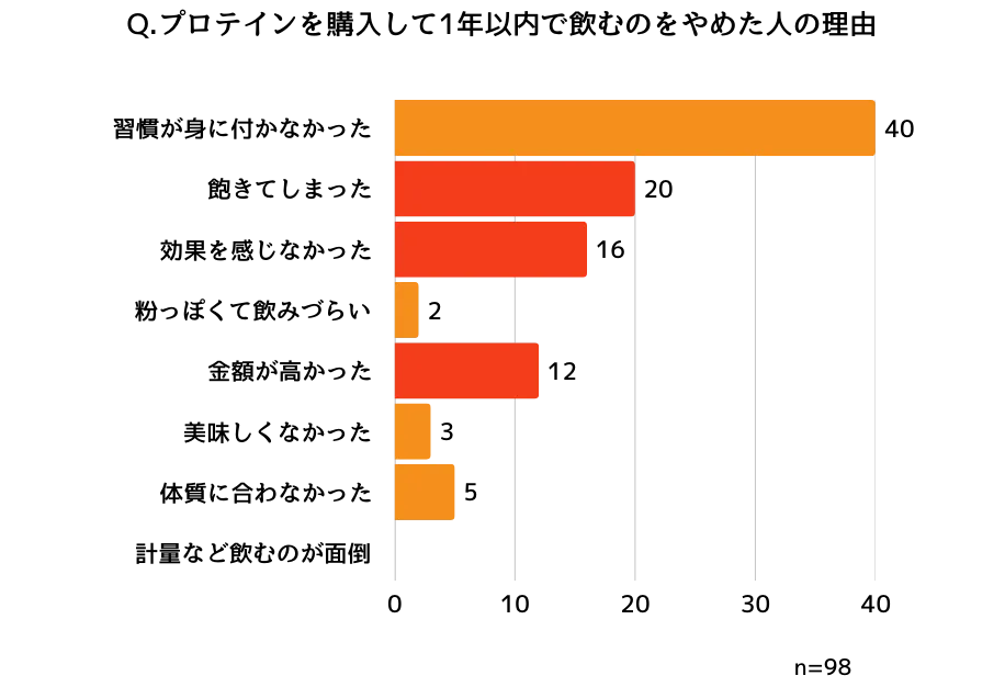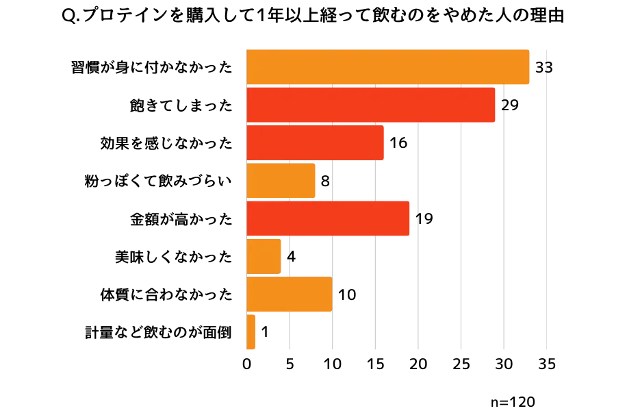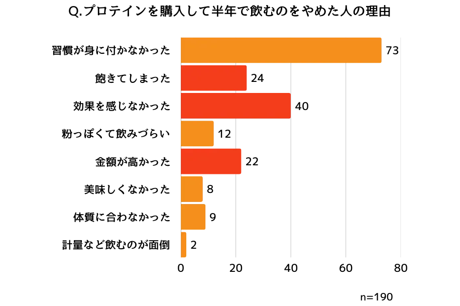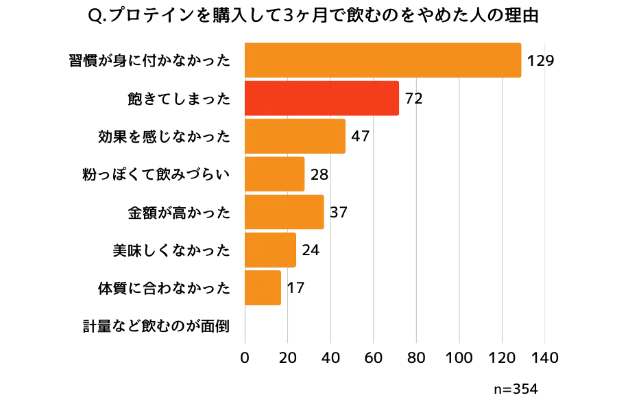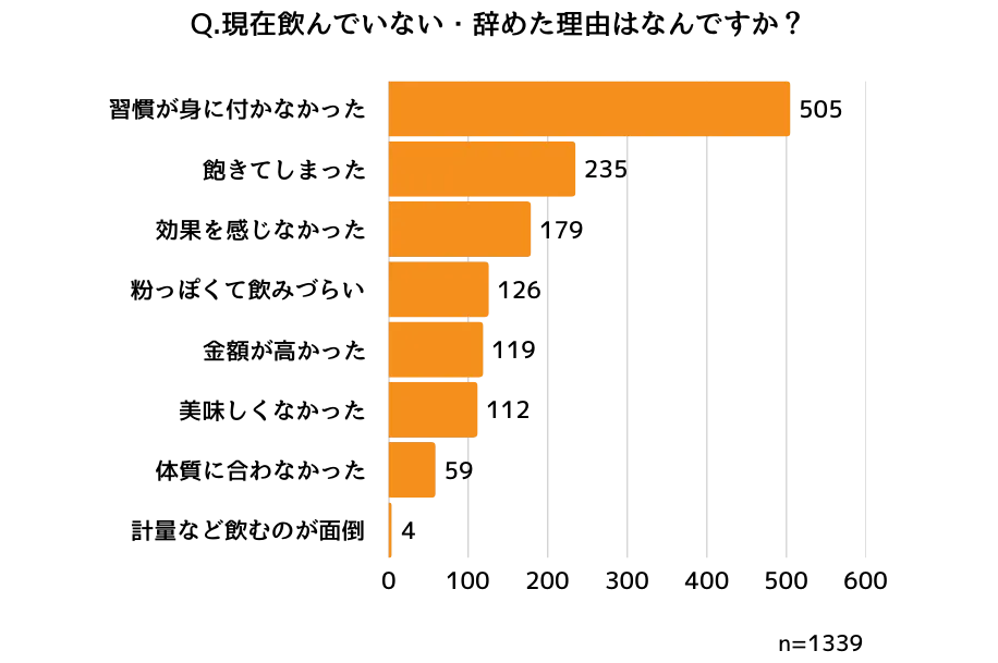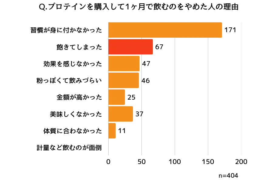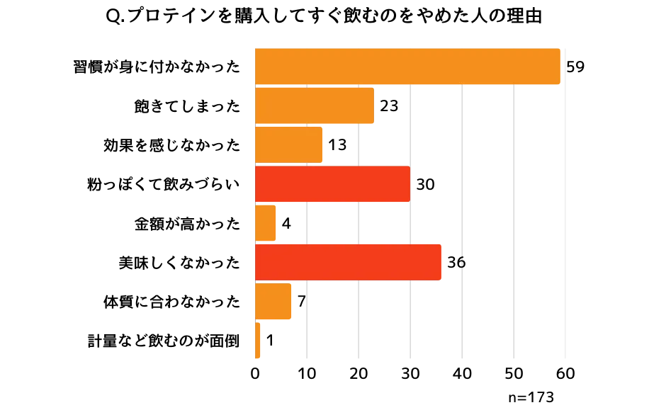 プロテイン特有の粉っぽさや味が受け入れられず、すぐに辞める方が多いことがわかりました。