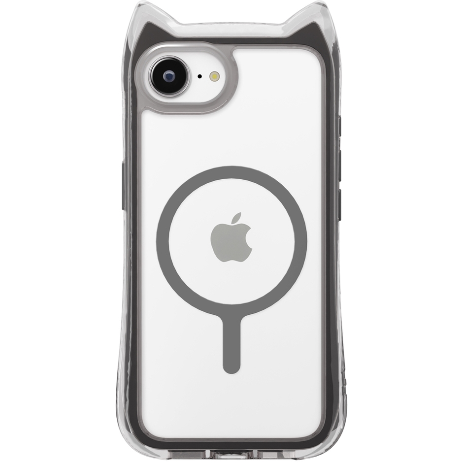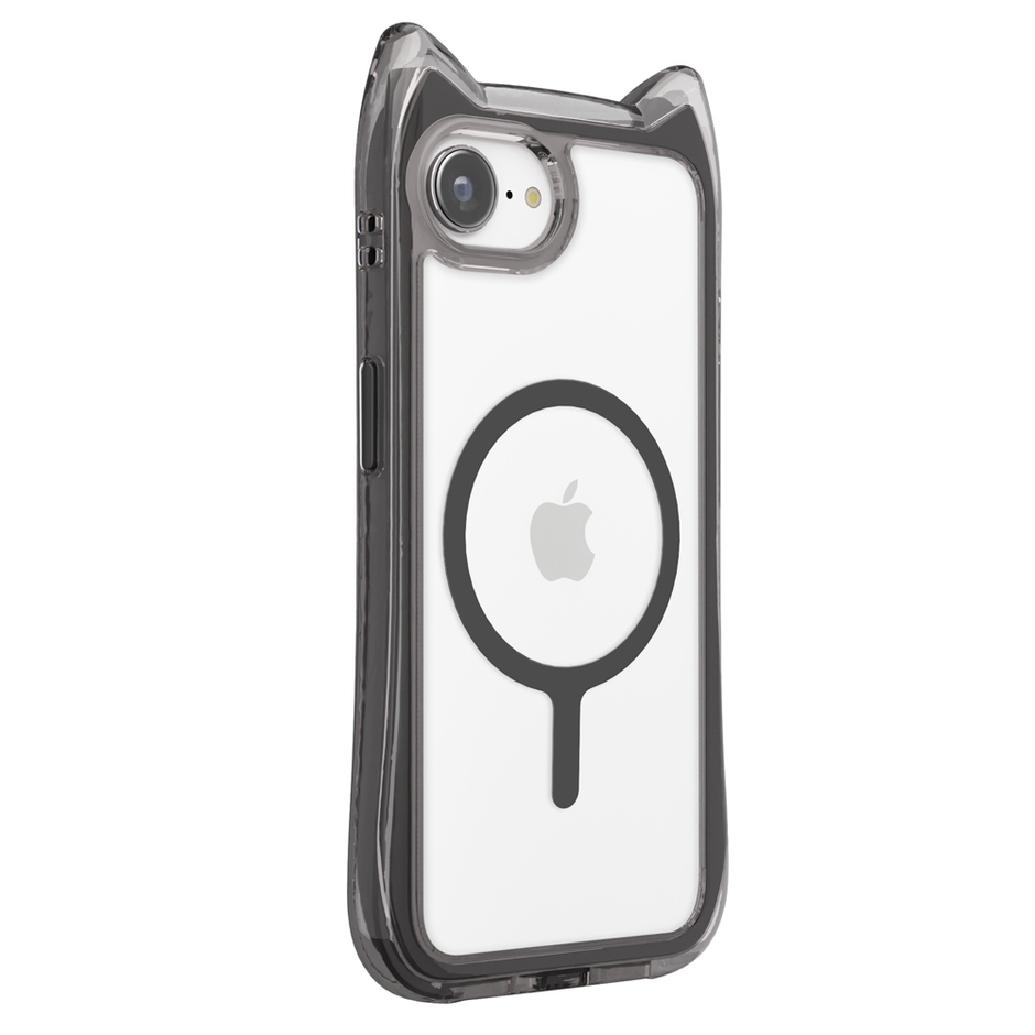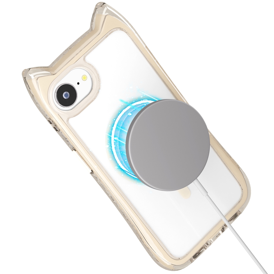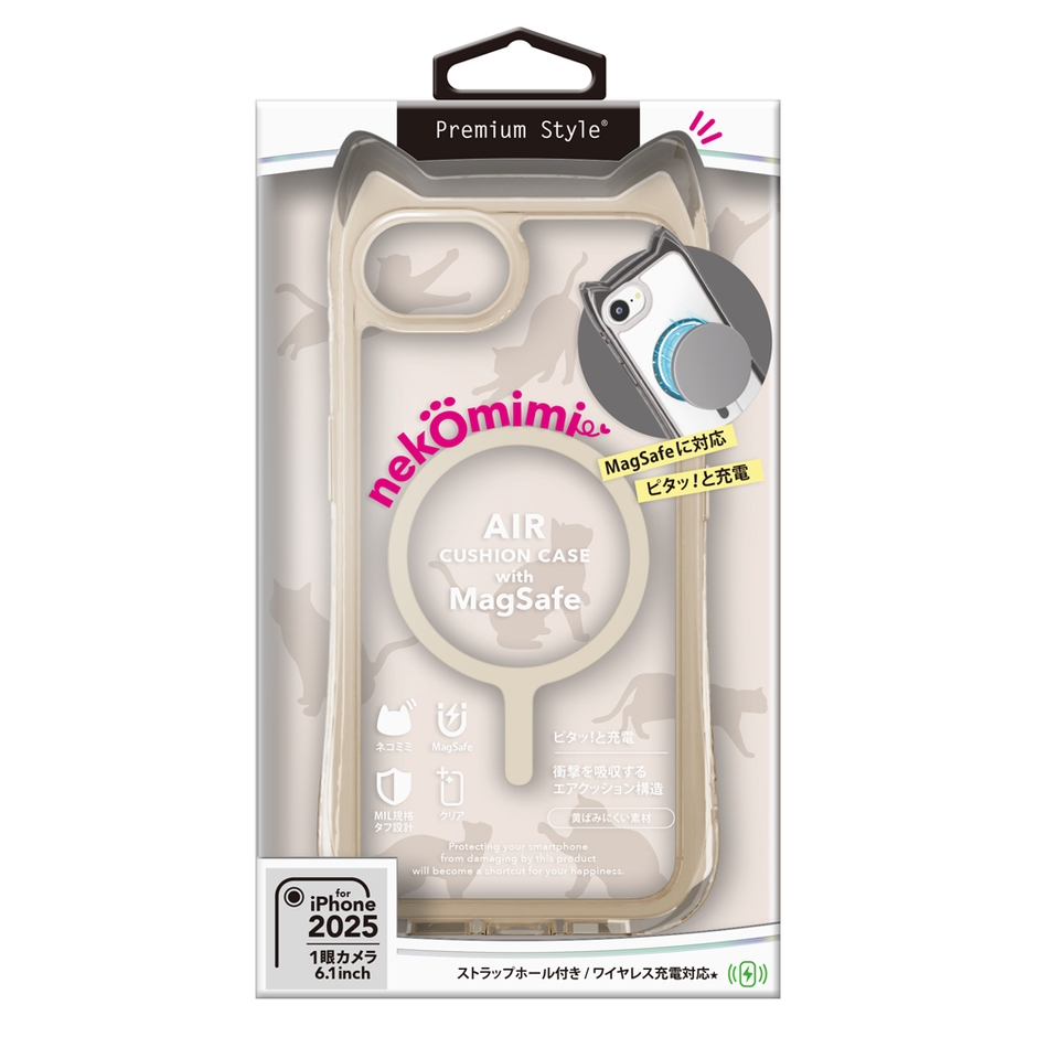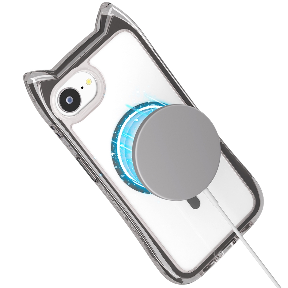 可愛らしい猫耳デザインの各種MagSafeアクセサリーに対応したiPhone 16e 用 ネコミミ エアクッションケースです。側面のTPU素材が2層構造で内側は硬質なTPU素材でiPhone本体をしっかりとホールド、外側は柔らかなTPU素材で手にフィットしやすく、外部の衝撃からiPhone本体をしっかり護ります。背面は、薄くて耐久性に優れたポリカーボネイトを採用し、iPhone本来のデザインを活かすクリアタイプ。シールや写真を入れて自分好みにカスタマイズすることが出来ます。メタルリング搭載でMagSafeアクセサリーをピタッと簡単装着。米国国防総省の軍用規格(MIL-STD-810G)の落下と振動試験をクリアしたタフ設計。お手持ちのストラップをつけて落下を防げるストラップホール付き。