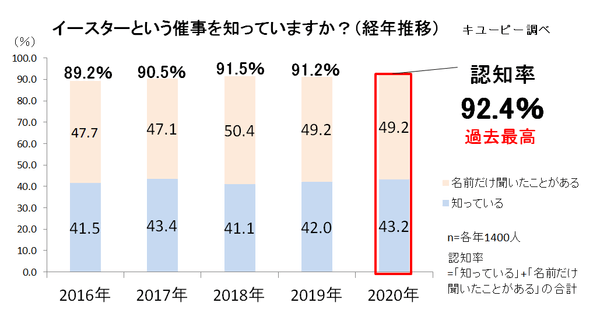 イースターは「復活祭」ともいわれ、キリスト教ではイエス・キリストの復活を祝う大切な祝日とされています。ヨーロッパなどでは春を祝う祭りとしている国もあります。年によって日付が変わるのが特徴で、今年は4/4と5/2の日曜日がイースターに当たります。卵とうさぎがシンボルで、「イースターエッグ」や「エッグハント」など、家族や仲間と一緒に楽しめる要素が多いことから、日本でも着実に浸透しています。2016年から実施しているキユーピーの調査(2020年)によると、「イースターという催事を知っていますか」という問いに対して「知っている」+「名前だけ聞いたことがある」と答えた人は92.4%となり、過去最高の認知率となりました。