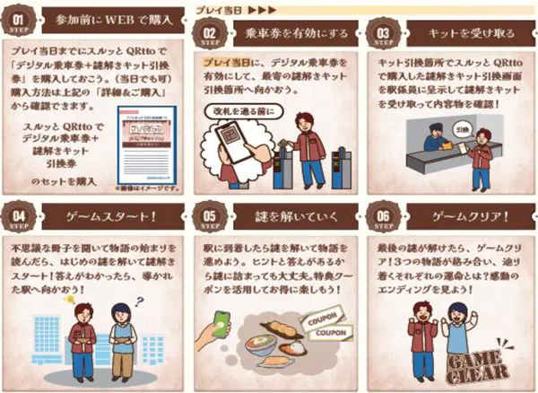 「謎解きキット引換券付きデジタル1日乗車券」をスルッとQRttoオンラインサイトでご購入いただきキット引換のうえ、記載の指示に従って、各駅周辺に仕掛けられた謎を解きながらゴールを目指す体感型のゲームイベントです。