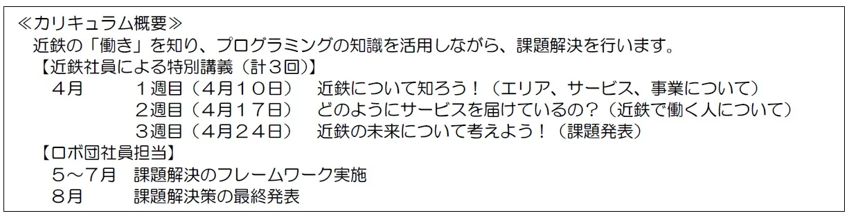 近鉄では、ロボットプログラミング教室を運営する夢見る株式会社(以下、ロボ団)が実施する新たなカリキュラム「FRONTIER(フロンティア)」で使用する小・中学生向けPBL(課題解決型学習)の教材をロボ団と共同で制作し、近鉄の社員がオンライン授業でロボ団の生徒に講義を行います。