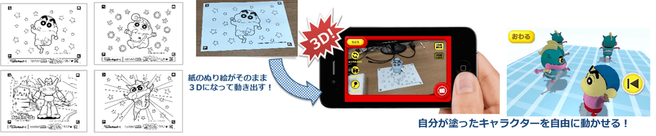 一方の【とびだすぬりえ】は、お子さまが大好きなぬりえにAR(拡張現実)技術と3D・インタラクティブの要素を加えた“新感覚ぬりえ”アプリです。専用のぬりえ台紙に色付けしてスマホカメラで取り込むと、クレヨンや色鉛筆で塗った質感をそのままに画面上で立体(3Dモデル)となり、AR技術により目の前にキャラクターが飛び出してきたかのような臨場感をお楽しみいただけます。完成した3Dモデルはコレクションしたり自由に動かして遊べるほか、AR機能によりスマホカメラで一緒に写真撮影が出来るなど、従来のぬりえの枠を超えたデジタルならではの楽しみ方でお子さまの想像力や感性を養います。