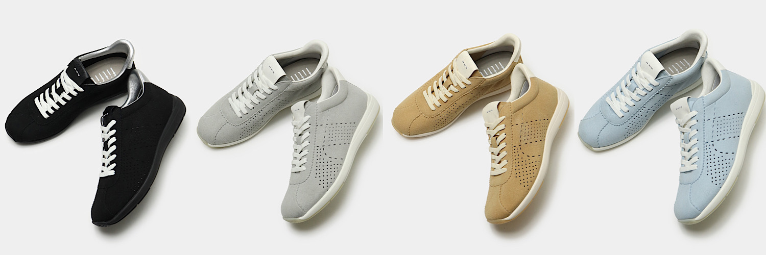 1. トレンドに合わせ、薄くすっきり見えるタイプの木型を採用。シャープに見せながら、実際には3Eワイズで幅広です。靴紐には結ぶ手間のないゴムを使用しており、脱ぎ履きも簡単。アッパーは裏無しのラフな雰囲気がありますが、ストレッチ素材を貼って処理してあるので色落ちなどの心配がありません。履き始めから足になじむソフトな履き心地です。