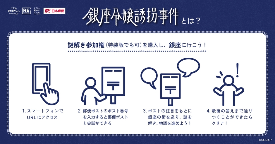 全世界で累計1,490万人以上を動員しているリアル脱出ゲームを企画制作する株式会社SCRAP(本社:東京都渋谷区、代表:加藤隆生)および日本郵便株式会社(東京都千代田区、代表取締役社長兼執行役員社長:千田 哲也)は、東京・銀座エリアに仕掛けられた謎を解きながらゲームクリアを目指す、ナゾトキ街歩きゲーム『銀座令嬢誘拐事件』を2025年3月13日(木)から2025年11月30日(日)まで追加開催することを決定いたしました。