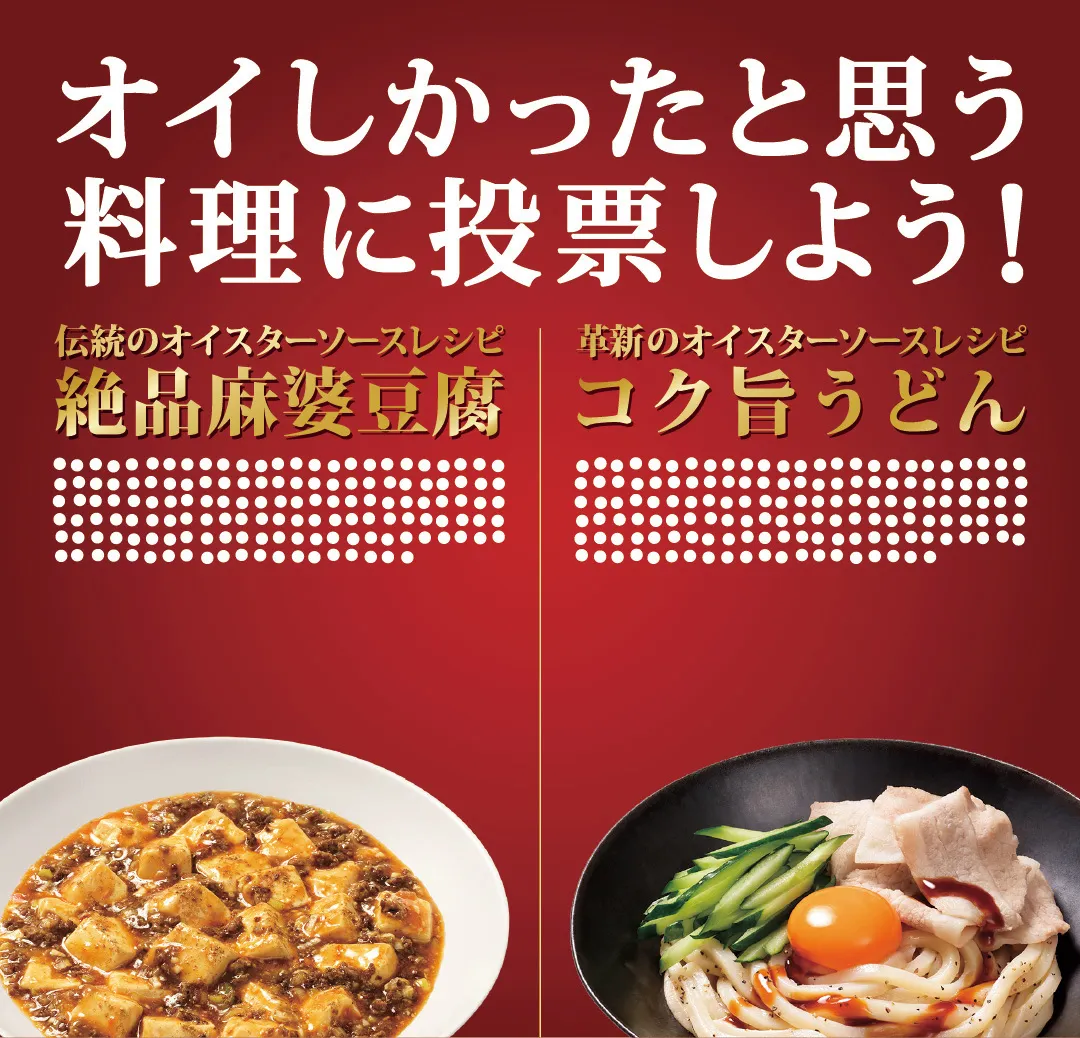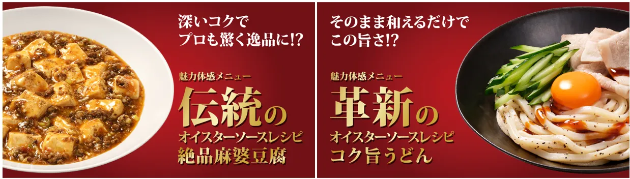 本ベントで提供する「絶品麻婆豆腐」と「コク旨うどん」のレシピは、特設サイト上で公開中。オイスターソースを使用した、旨みとコクがたっぷりのメニューを家庭でもお楽しみください。