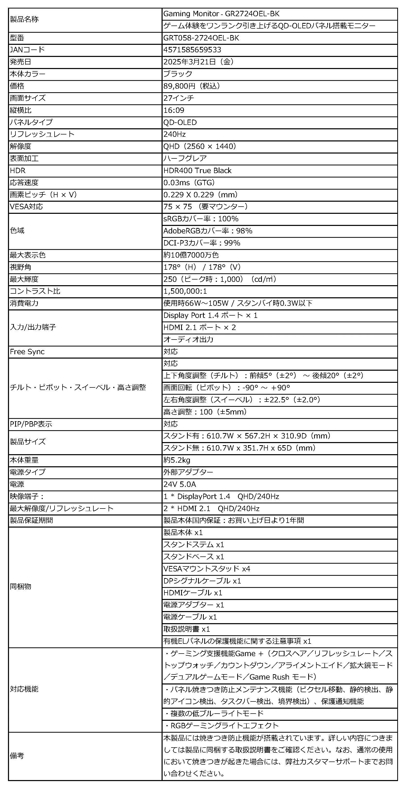 『GRAPHT STANDARD』シリーズより、QD-OLEDパネル搭載、 応答速度0.03ms、リフレッシュレート240Hzの 『Gaming Monitor(GR2724OEL-BK)』を3月21日(金)に発売