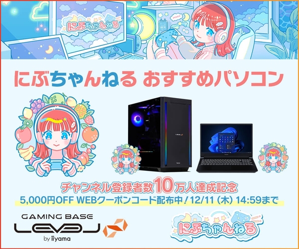 パソコン工房・グッドウィルを運営する株式会社ユニットコム(代表取締役:端田 泰三、本社:大阪市浪速区)は、iiyama PC ゲーミング PC シリーズ「LEVEL∞(レベル インフィニティ)」より、「にぶちゃんねる」のチャンネル登録者数10万人達成を記念して、「にぶちゃんねる」おすすめパソコンを購入の際に使える、5,000円OFF WEBクーポンコードの配布を2025年11月28日(金)から実施いたします。