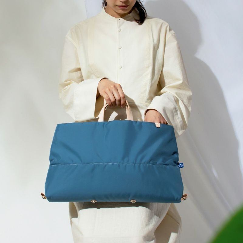 北海道の道東エリアで回収した廃棄漁網を活用し、ごみの分別や洗浄などを経て、原料となる再生ペレットを製造。製糸、織布の各過程をアライアンスに加盟する複数企業の協働を経た後、豊岡鞄認定企業により、鞄へと生まれ変わります。美しい海をイメージした、ディープブルーとオーシャンブルーと、美しい砂浜をイメージしたサンドベージュなどのバリエーションを展開。持つだけで海辺の爽やかな空気を感じられるようなカラーです。軽くてやさしい手触りも特徴です。