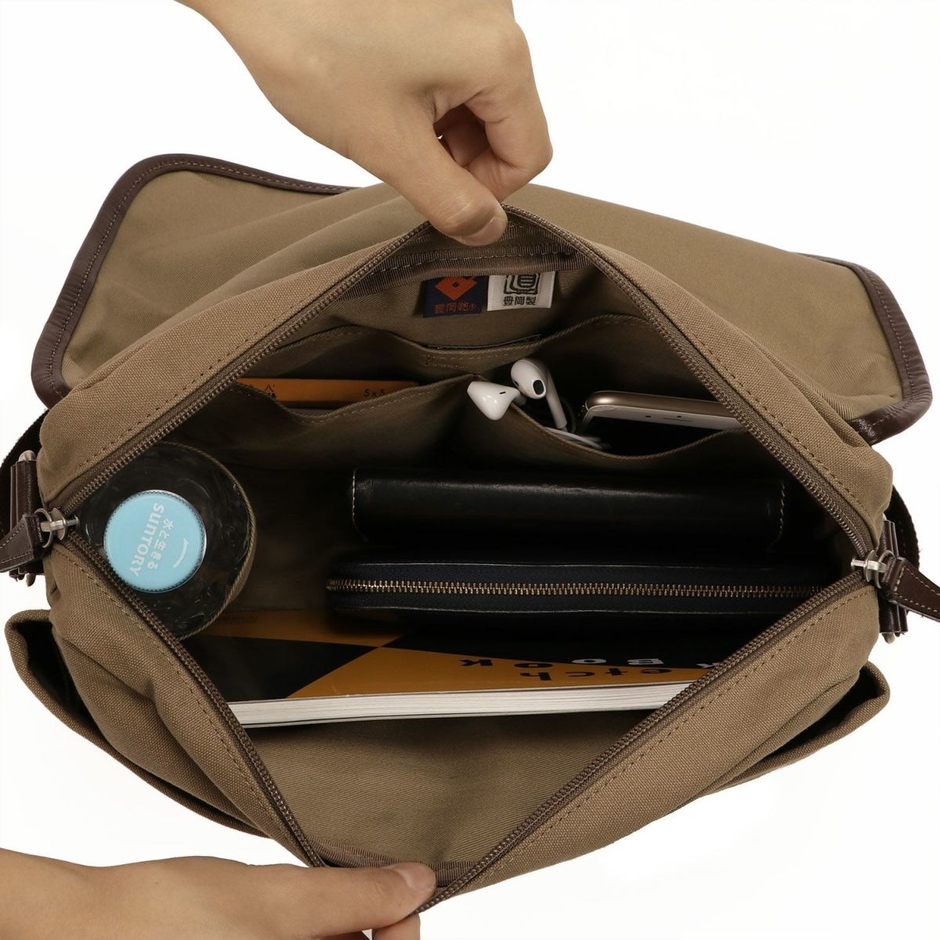 特徴的な金具が付属したカブセ型の帆布ショルダーバッグ。パラフィン樹脂加工(石蝋に漬け込む撥水加工)を施された10号帆布に洗い加工を施すことで、ナチュラルなシワ感や風合いの変化をお楽しみいただけます。メインルームは長財布、ペットボトル、B5サイズのノートなどを収納可能。ポケットも多く小物も整理しやすい仕様です。