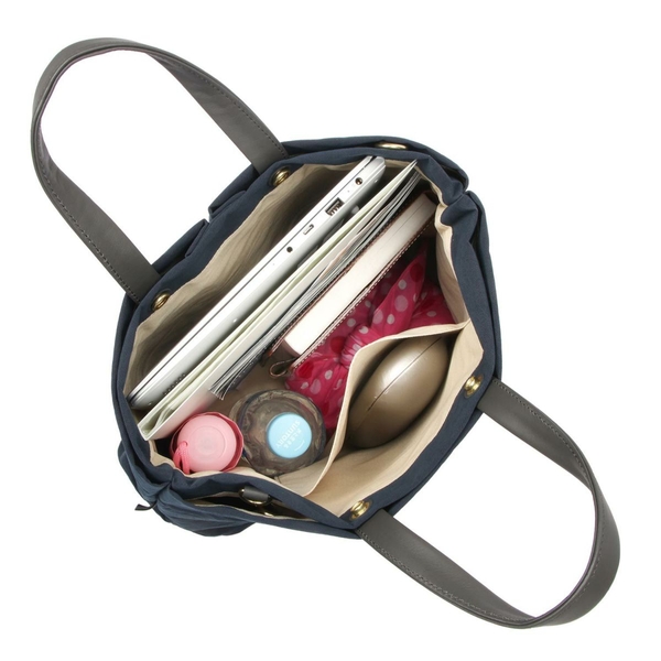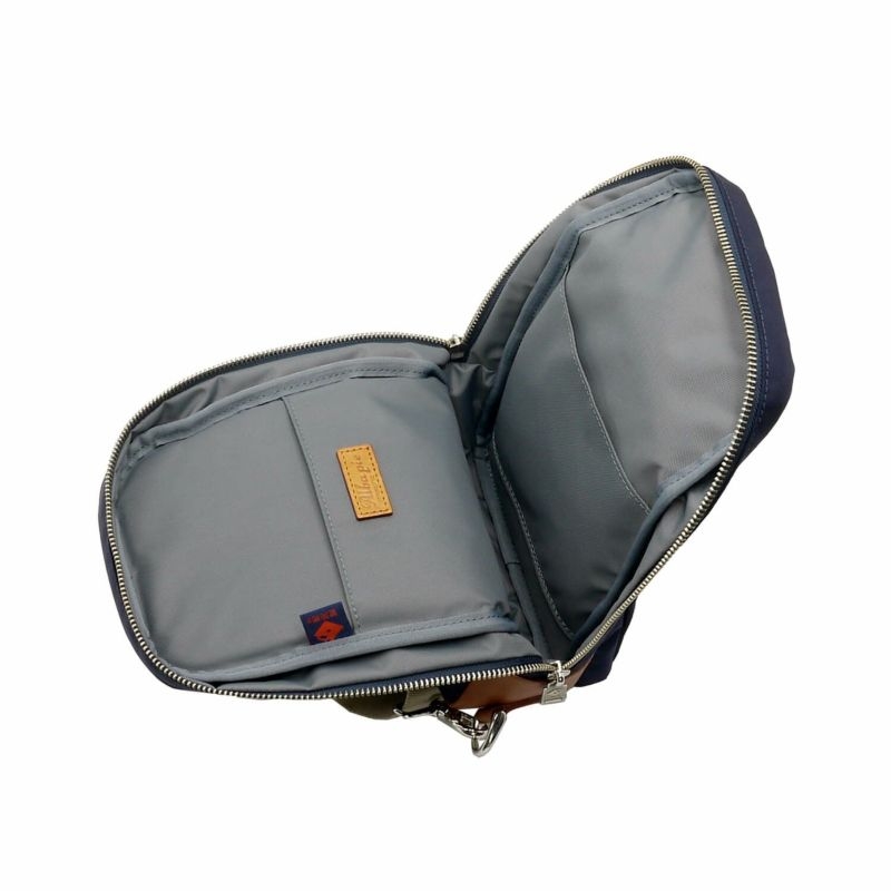 活用シーンが多い、A4ファイルが2~3冊収納できる容量を備えた手持ち・ショルダーの2WAYバッグ。ポイントは、ペットボトルや折りたたみ傘等を収納できる深さのある4つの外ポケット。本体素材は小松マテーレ株式会社の上質ナイロン「KONBU-N」を使用しています。この生地は撥水性が高く独特の個性的なシワが特徴。張り感と程良い硬さがあり、分厚い芯材を入れずに自立が可能です。そのため約500gと軽さも魅力。ショルダーベルトとハンドルはグレーの革を使用し、アンティークゴールドの金具とともにアクセントになっています。