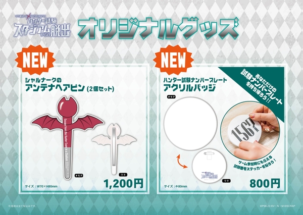 新商品には リアル脱出ゲーム本編にも登場するキャラクター、シャルナークの念能力「携帯する他人の運命(ブラックボイス)」をモチーフにした「シャルナークのアンテナヘアピン」と、アニメにも登場するハンター試験のナンバープレートを再現した「ハンター試験ナンバープレートアクリルバッジ」をラインナップ。