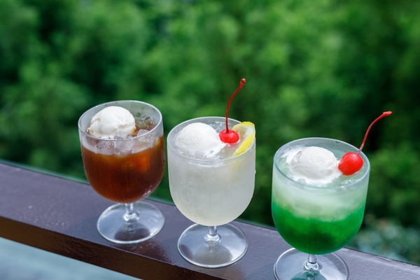 お好きなドリンクを片手に、里山を眺めながら大人時間を過ごせる「アフタヌーンBeerテラス×水鏡の庭」を開催中。夏にぴったりの瓶ビールや、懐かしい味わいのメロンクリームソーダなどのアイテムで、夏空と深緑につつまれながら自由で快適な滞在が愉しめる。