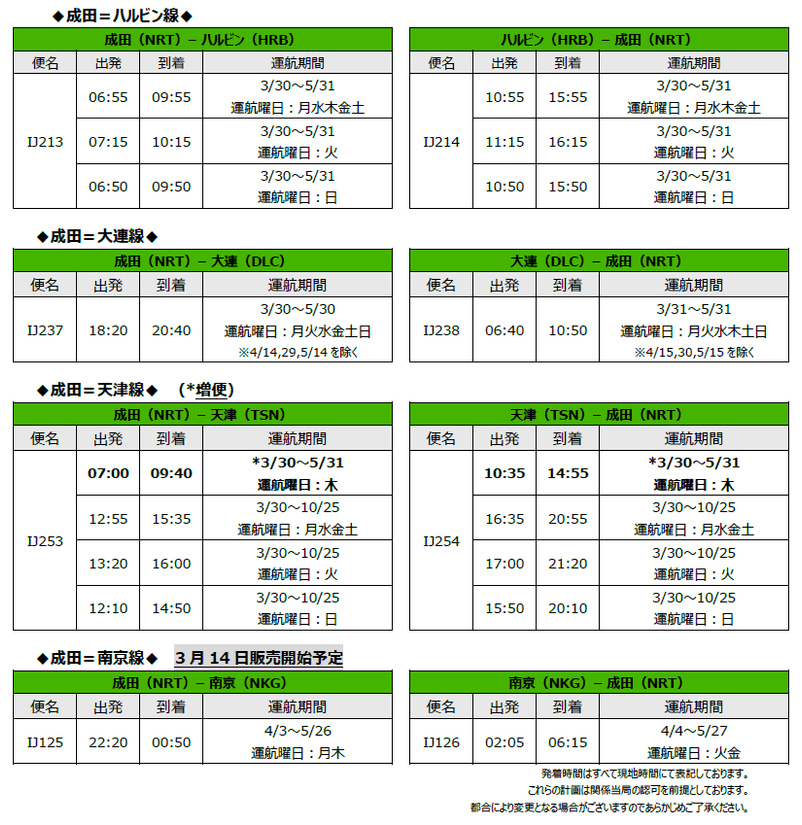 2025年3月11日 13:00 JALグループのLCCであるスプリング・ジャパン株式会社(以下:スプリング・ジャパン)は、2025年度夏ダイヤの成田=ハルビン線、大連線の運航および天津線の増便を以下のとおり決定し、本日15時より販売を開始します。
