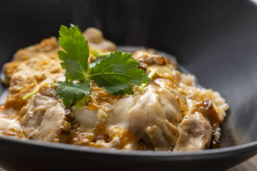 TAMAGOYA1番人気の知床鶏と千歳産卵を使ったふわとろ親子丼です。