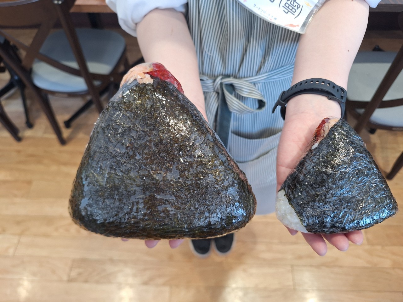 1個約555gの特大おにぎり。中には北海道産の塩鮭がたっぷり入っています。通常のおにぎりの約4倍の大満足サイズです。