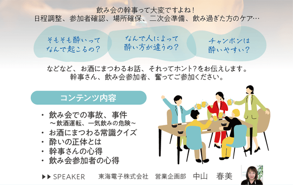アルコール検知システム、 IT点呼システム、 運行管理システムを開発・販売する東海電子株式会社(本社:静岡県富士市 代表取締役 杉本 哲也)は、 この度、「【幹事の心得・飲み会参加者の心得】忘年会シーズン到来!忘年会参加のその前に… 飲酒基礎講座」無料ウェビナーを12月21日(木)に開催いたします。