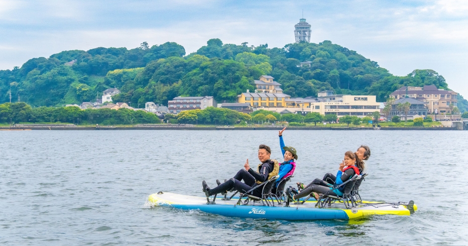 江ノ島の景色をバックに最大4人乗りの足漕ぎペダル式ボードを体験する様子
