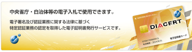 「DIACERTサービス」とは、「電子署名法」に基づく特定認証業務として、国の認定を取得した電子証明書発行サービスです。政府の推進する認証局の新暗号方式にいち早く対応致しました。