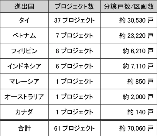 当社では、現在、ASEAN諸国等を中心に不動産事業を強化すべく、さまざまな取組を進めていますが、そのうち海外での住宅分譲事業は、本プロジェクトにより、参画累計総数が61プロジェクト(約70,060戸)となります。