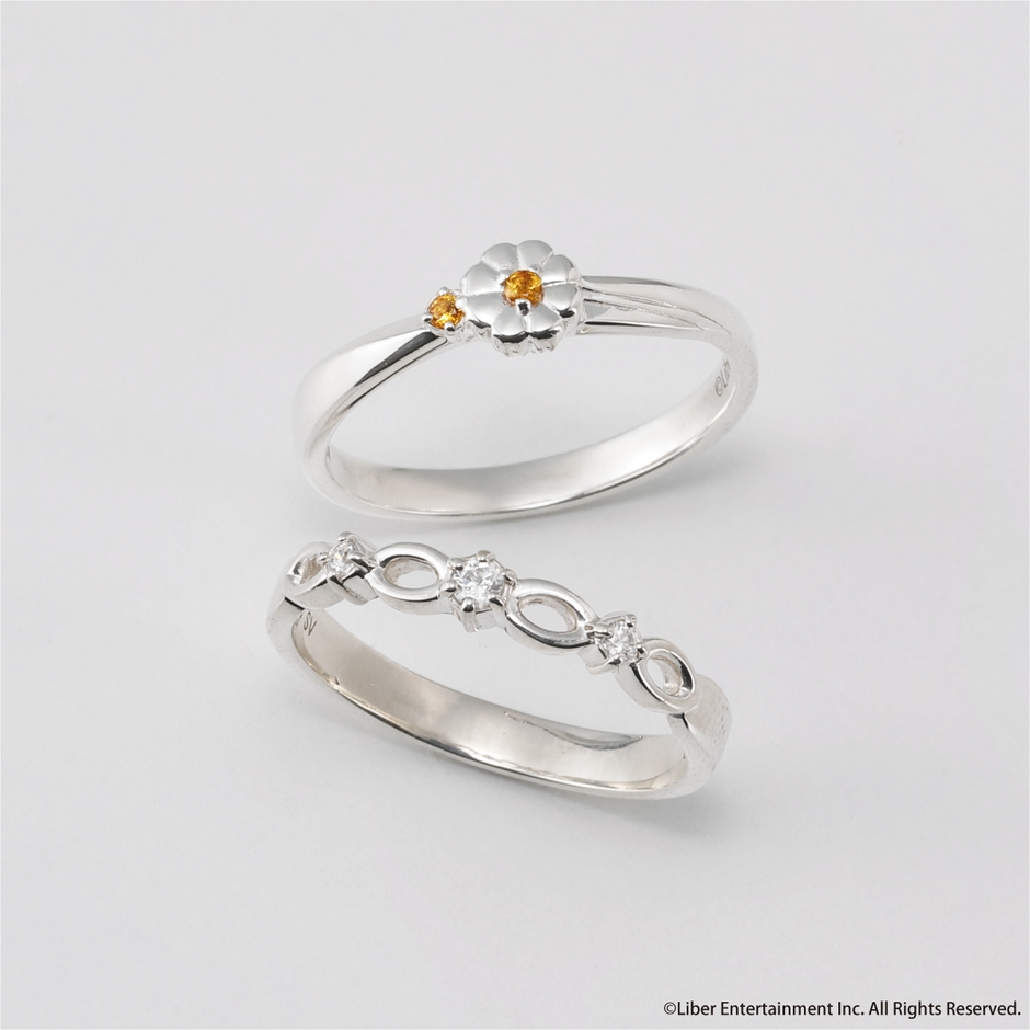 夏組と各劇団員のイメージカラーストーン2石がきらめくモチーフフラワーのリングと、8周年をイメージしたインフィニティデザインのリングを組み合わせた2本セットの8周年特別アイテム。