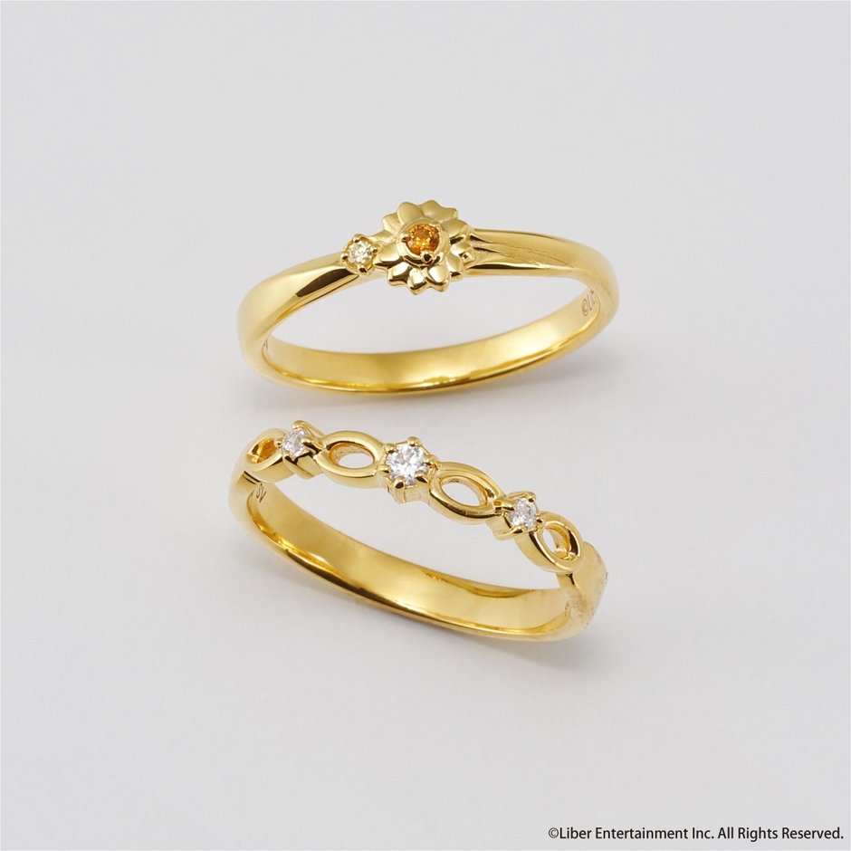 夏組のロゴをイメージし、モチーフフラワーと組み合わせたダブルリング風のデザイン。夏組と各劇団員のイメージカラーストーンを2石セットし、イエローゴールドカラーで仕上げました。
