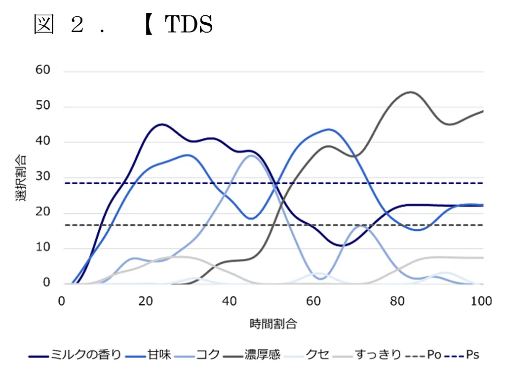 時間経過毎の風味特徴の変化を記録する官能評価手法(Time Intensity法:TI法、Temporal Dominance of Sensation法:TDS法)を用いて、超高温瞬間殺菌(UHT)牛乳を口に含んでから飲み込んだ後までの風味を評価した。