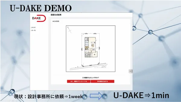 AIを駆使した戸建て住宅設計図の自動設計ツール『AI建築家U-DAKE』を提供。